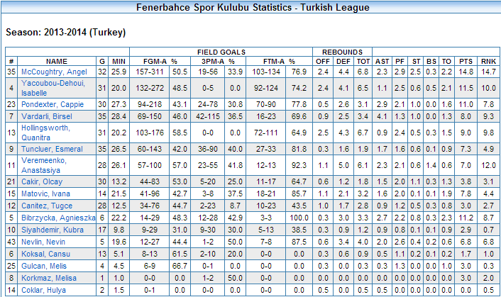 FENERBAHÇE TKBL 2013-2014 LİG İSTATİSTİKLERİ
